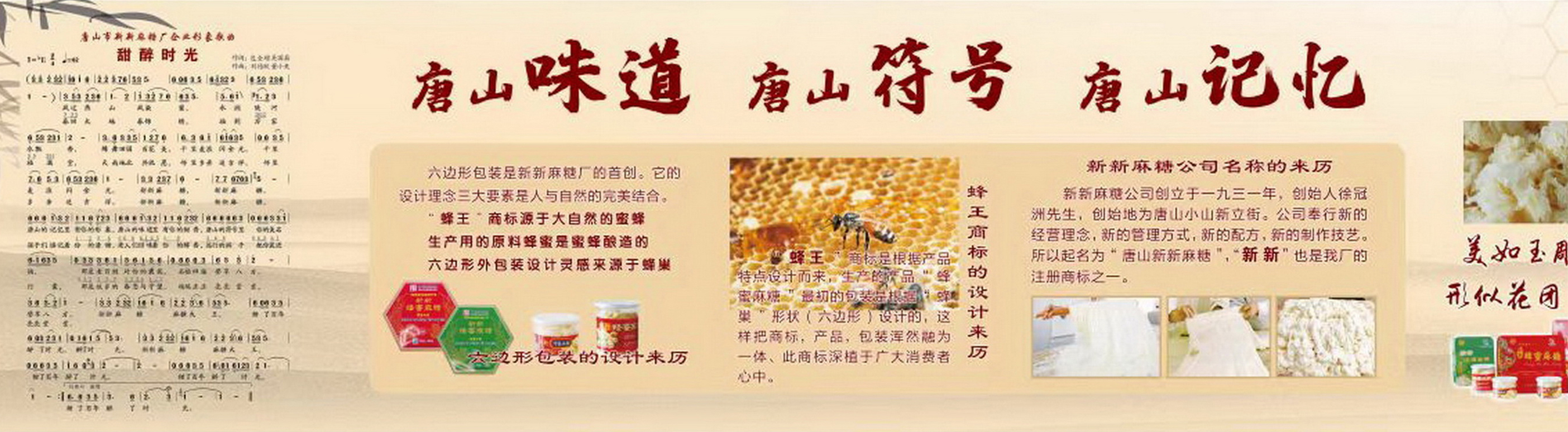 麻糖兴起唐山镇,新新制品更加强。口福只应唐山享,外地能得几人尝。唐山土产一曰烧鸡,二曰麻糖。烧鸡到外皆有,只是作法不同,而麻糖——可称为唐山特产也。唐山首创麻糖者为新新商店,每有到唐山旅行者,莫不由新新商店购买麻糖,带回馈送亲友尤有平(京)津人士,专程到唐山来买新新商店麻糖者,其声名之大,可见一般。记者只知该号麻糖佳美,而不知其佳美之所以然。促我往访,承该号经理徐冠洲接见,据徐君谈伊本北平郁文大学出身,曾服务各界,对于商业,是门外汉。于几年前,因亲老不愿儿远出,遂在公元一九三一年,唐山设镇之始,在唐山新立街开设新新商店。又二年,在便宜街开设分号,创立了唐山麻糖又称蜂蜜麻糖。唐山麻糖,源于冀东民间,百姓逢年节,用白糖合面...